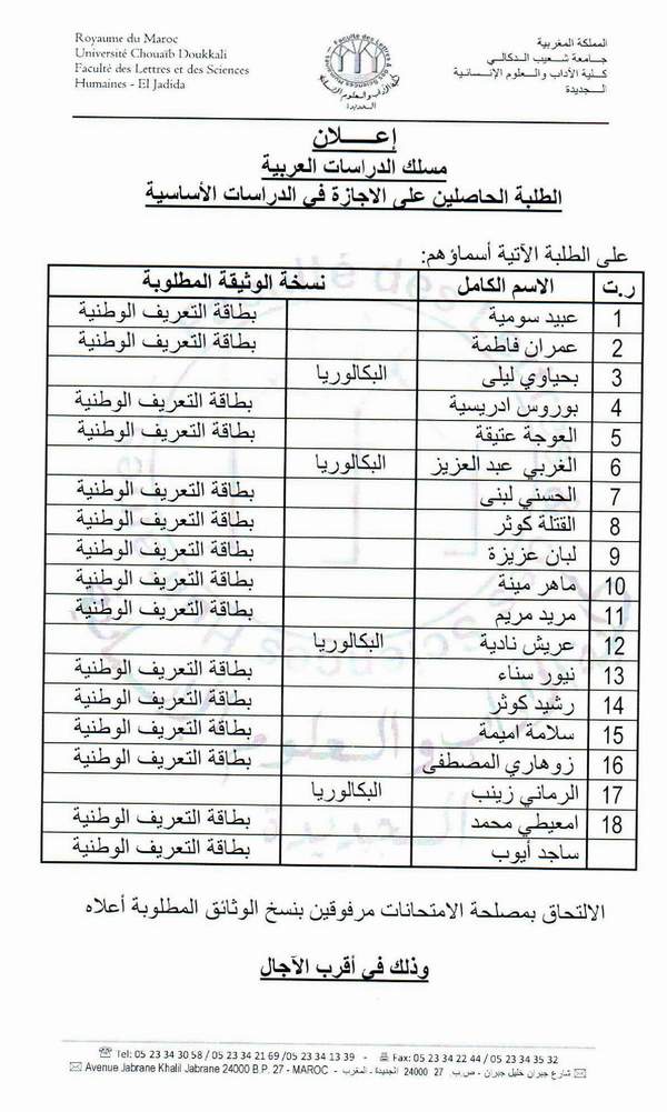 على الطلبة الآتية أسماؤهمالالتحاق بمصلحة الامتحانات مرفوقين بالوثائق المطلوبة منهم: