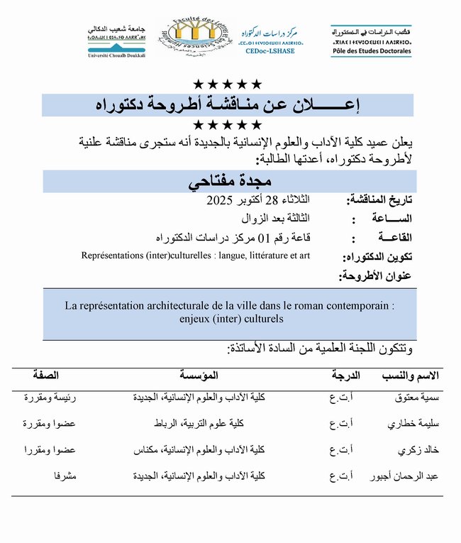 يعلن عميد كلية الآداب والعلوم الإنسانية بالجديدة أنه ستجرى مناقشة عمومية لأطروحات جامعية خلال شهر أكتوبر 2025: