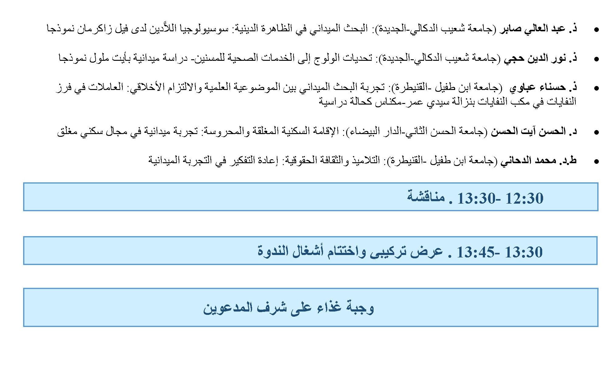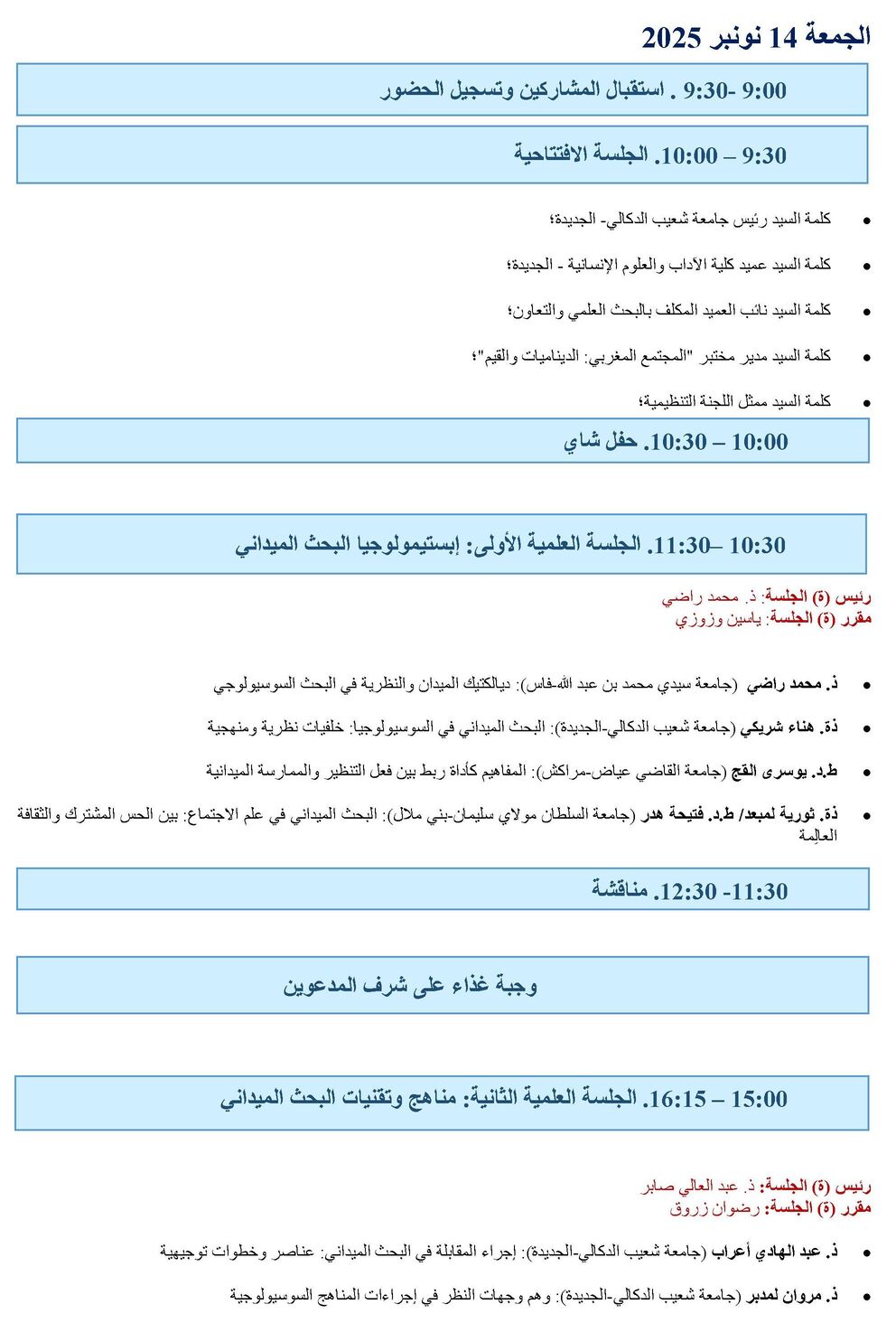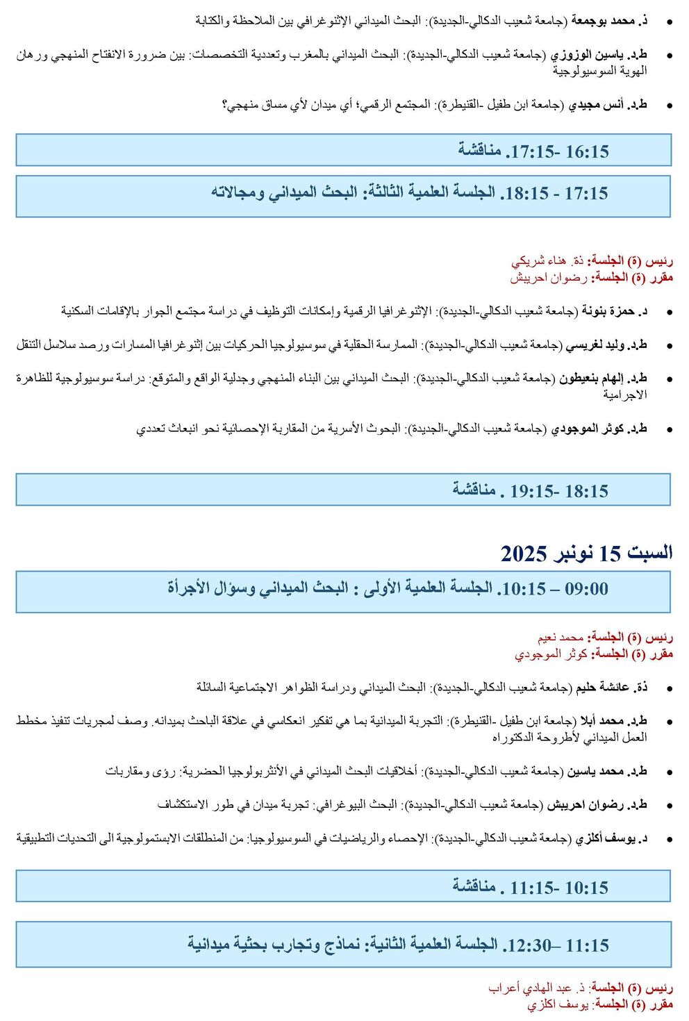 Posted on 13 أكتوبر 2025 594 مشاهدة برنامج اليومين الدراسيين: البحث الميداني في علم الاجتماع قضايا التنظير والممارسة يومي 14 و 15 نونبر 2025