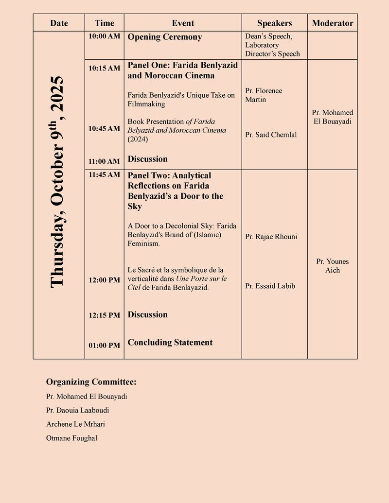 Posted on 7 أكتوبر 2025 502 مشاهدة A Study day on “Farida Benlyazid and Moroccan Cinema” Thurdsday, October 9th, 2025 at 09:30